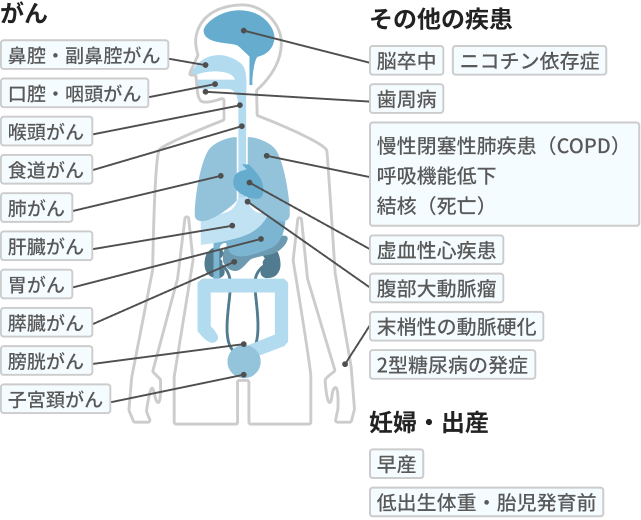 喫煙は、さまざまな重大な病気を引き起こす可能性があります。タバコに含まれる有害物質の健康被害については、多くの科学的な研究により明らかになっています。