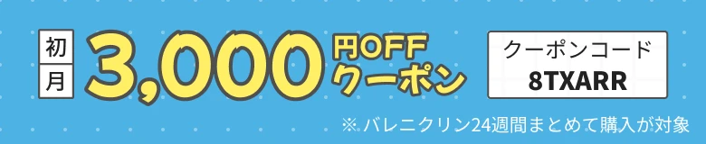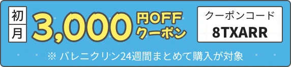 - バレニクリン24週間まとめてプログラムに3,000円OFFクーポンを適用した初月の1日あたりの価格です