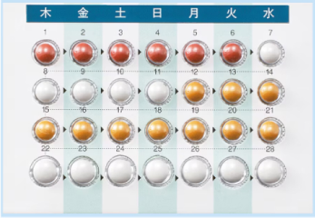 ③偽薬を全て飲み終わりましたら(7日休薬でもOK /この期間に出血が起こる)残っている錠剤の続きから服用開始ください。